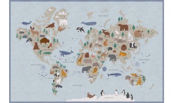 שטיח פיויסי לילדים מפת עולם חיות באנגלית כחול