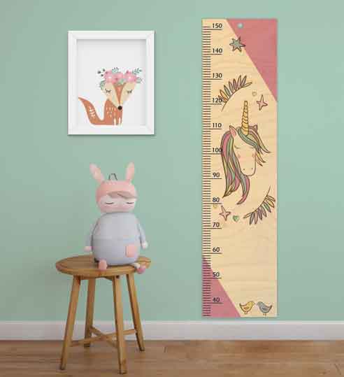 מד גובה מעוצב, מודפס על גבי לוח עץ, עם איור של חד קרן בצבעי פסטל עדינים: ורוד ותכלת