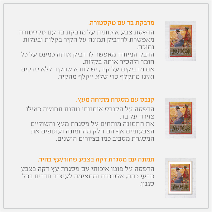 את התמונות אפשר להזמין כ-מדבקות בד, תמונות ממוסגרות ותמונות קנבס מתוחות על מסגרת עץ.