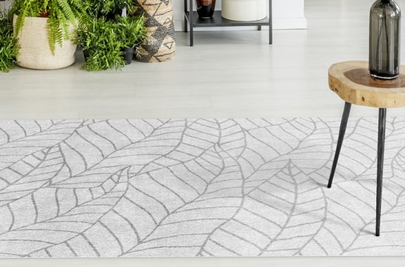 שטיח מעוצב, מודפס על גבי PVC, בסגנון בוטני אבסטרקטי בצבעים: אפור, בז’, לבן וצבעוני