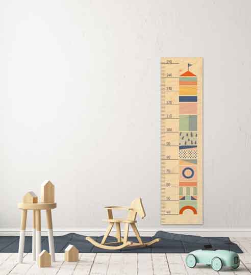 מד גובה מעוצב, מודפס על גבי לוח עץ, עם איור של מגדל קוביות בצבעי פסטל עדינים