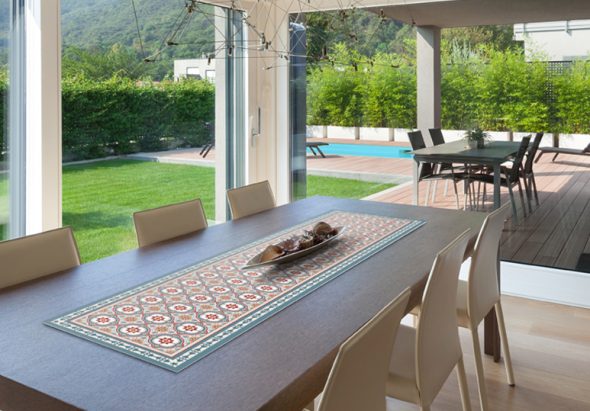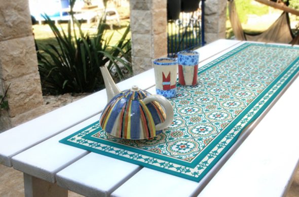 ראנר מעוצב, מודפס על גבי PVC, בדוגמת אריחים קלאסיים, בסגנון ספרדי, בצבעים טורקיז וכחול