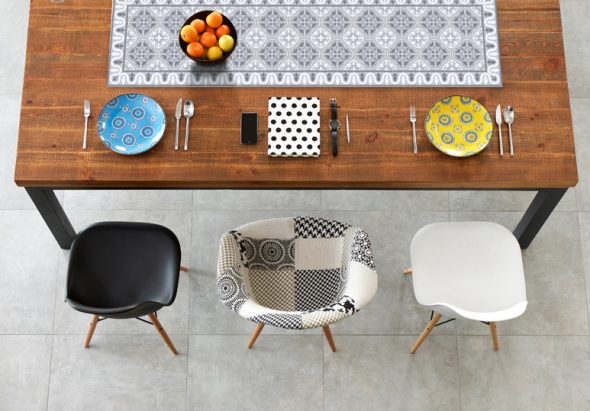 ראנר מעוצב, מודפס על גבי PVC, בסגנון אריחים ספרדי,  בצבעים: אקווה, אפור וירוק
