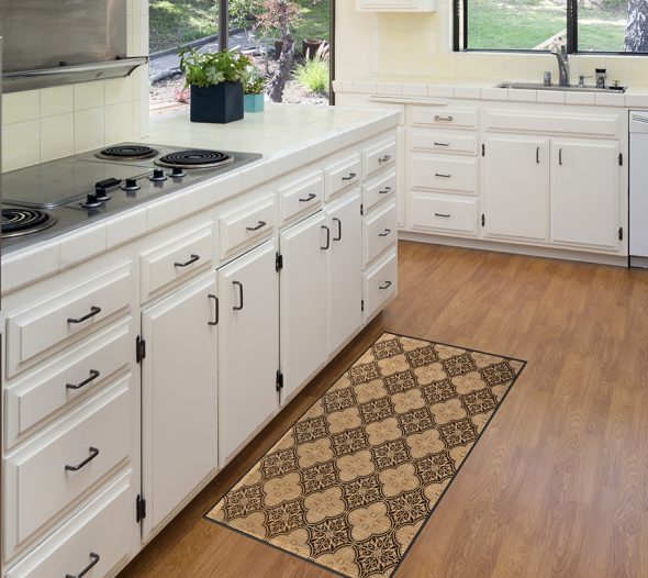 שטיח מעוצב, מודפס על גבי פסי במבוק טבעי, בדוגמת אריחים קלאסיים, בצבעים: שחור