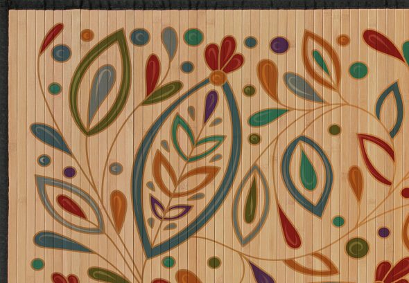 שטיח מעוצב, מודפס על גבי פסי במבוק טבעי, בסגנון גרפי בוטני.