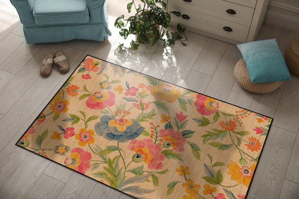 שטיח מעוצב, מודפס על גבי פסי במבוק טבעי, בסגנון בוטני צבעוני.
