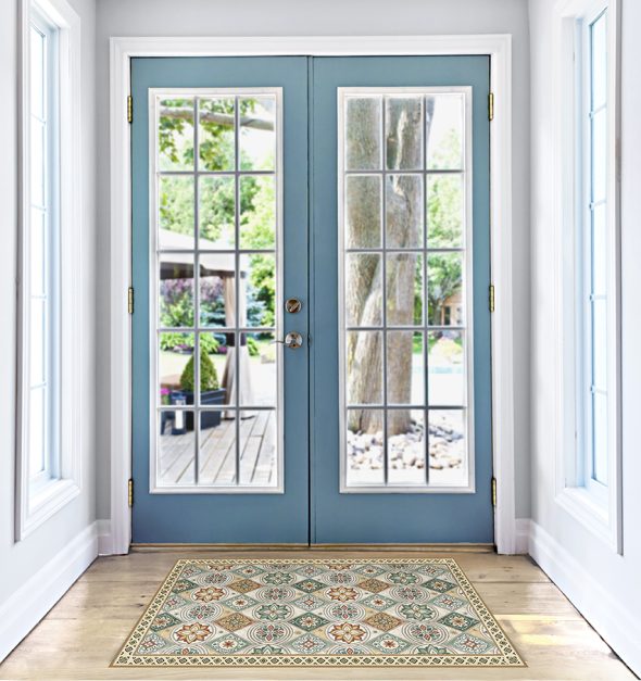 שטיח מעוצב, מודפס על גבי PVC, בסגנון אריחים עתיקים, בצבעים: אפור ובג' וירוק.