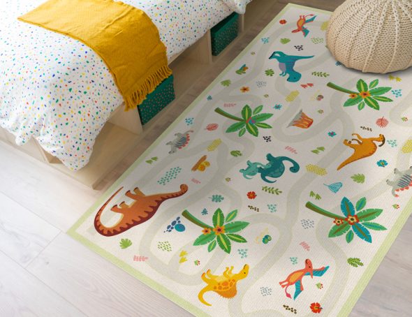 שטיח מעוצב, מודפס על גבי PVC, שטיח משחק, מבוך דינוזאורים – עזרו לדינוזאורים למצוא את דרכם! בדפוס של דינוזאורים ציבעוניים