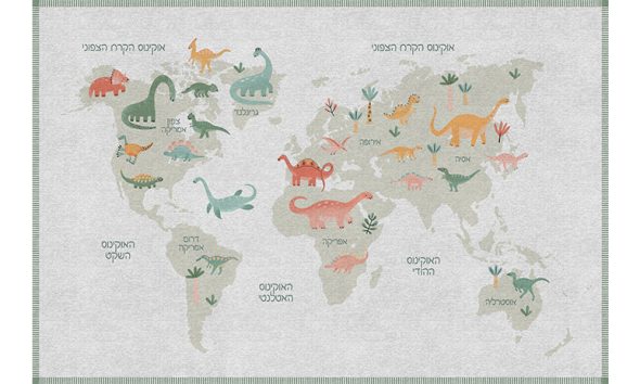שטיח מעוצב, מודפס על גבי PVC, מפת עולם עם איורי דינוזאורים ושמות האזורים הגאוגרפים בעברית. שטיח לימודי, כיפי ומפתח דמיון ומשחק בצבעים: ירוק, כחול או בז'