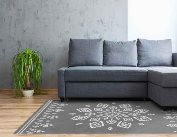 שטיח מעוצב, מודפס על גבי PVC, בסגנון גיאומטרי אתני בצבעים: אפור, אפור בז', בז', בז' ושחור, חום, טורקיז וכחול