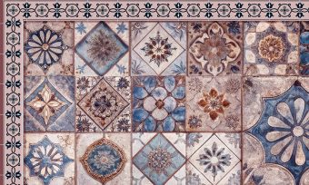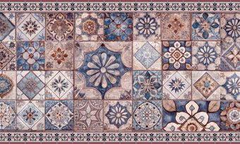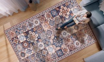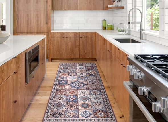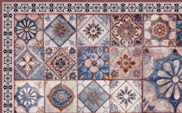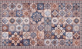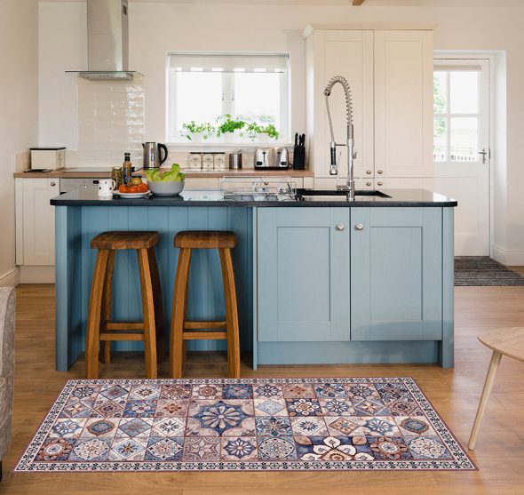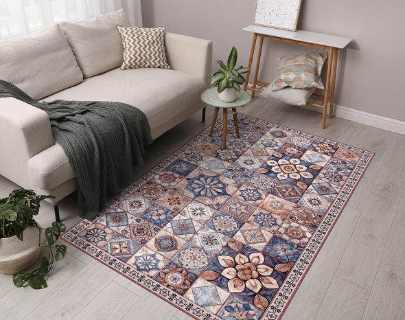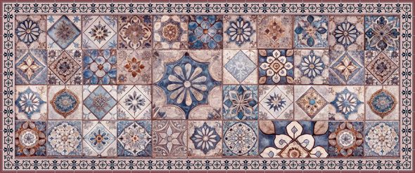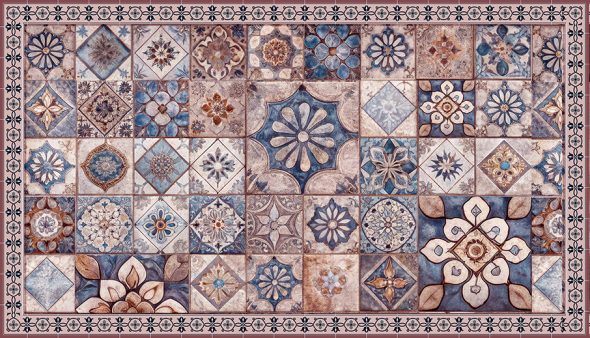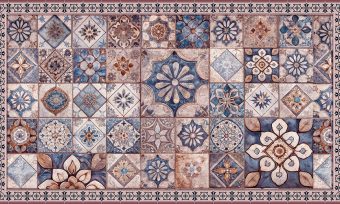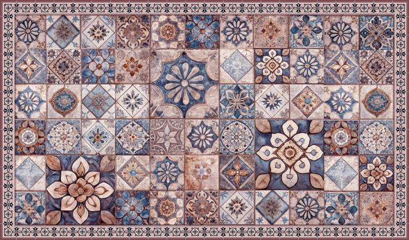 שטיח מעוצב, מודפס על גבי PVC, בצבע טורקיז וחום, כחול ובג'