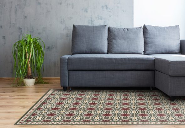 שטיח מעוצב, מודפס על גבי PVC עבה במיוחד, בסגנון אריחים ספרדיים, מוזאיקה בצבעים: ירוק ובורדו, כחול וחום.