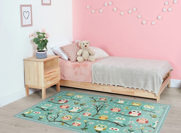 שטיח מעוצב, מודפס על גבי PVC עבה במיוחד, איור בסגנון דפוס ינשופים צבעוניים ברקע טורקיז