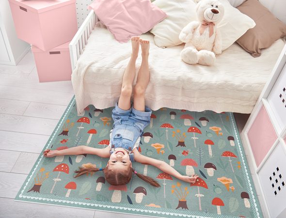 שטיח מעוצב, מודפס על גבי PVC עבה במיוחד, איור בסגנון דפוס פטריות ביער.