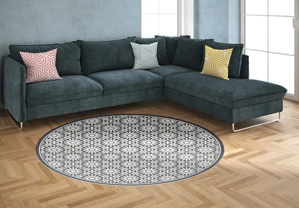 שטיח מעוצב, מודפס על גבי PVC, בסגנון אריחים מרוקאים, מוזאיקה בצבעים: אפור כהה, טרקוטה, כחול, שחור ותכלת