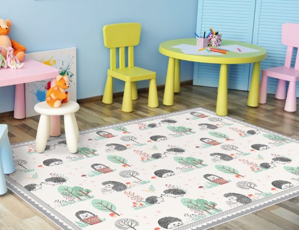 שטיח מעוצב, מודפס על גבי PVC עבה במיוחד, איור בסגנון דפוס חיות עם קיפודים בצבעים: אפור, ורוד וטורקיז